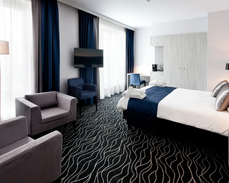 Idéale pour les voyageurs d’affaires, notre Business Suite de 45 m² allie espace et fonctionnalité pour un séjour productif et confortable à Mons. Cette chambre spacieuse dispose d’un lit queen size pour des nuits reposantes, d’un balcon privé offrant une vue agréable, ainsi que d’une salle de bain raffinée équipée d’une baignoire à jets et d’une douche séparée, pour un moment de détente après une journée bien remplie.
