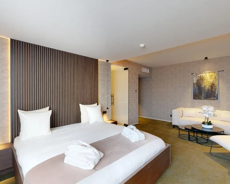 Vous profiterez d’un espace généreux, parfait pour une nuit romantique, un moment de détente ou un séjour haut de gamme à Mons. La chambre est équipée d’un bureau avec chaise, d’une TV écran plat, de meubles modernes, d’un mini-bar avec eaux minérales, ainsi que de peignoirs douillets pour un confort absolu.