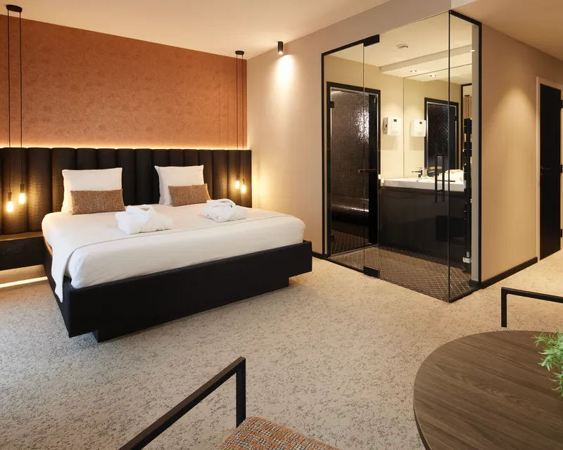 Avec ses 35 m², la Suite Orientale, notre chambre avec hammam à Mons, vous plonge dans une ambiance exotique et apaisante. Cette suite spacieuse dispose d’un lit double confortable et d’une salle de bain équipée d’un hammam privatif ainsi que d’une douche à l’italienne moderne, combinant détente et bien-être pour un séjour inoubliable à Mons.