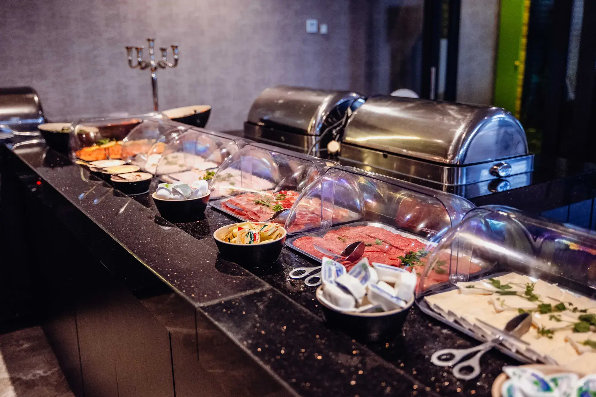 Plats Chauds & Froids : Bacon, saucisses, saumon fumé, charcuteries et fromages fins.